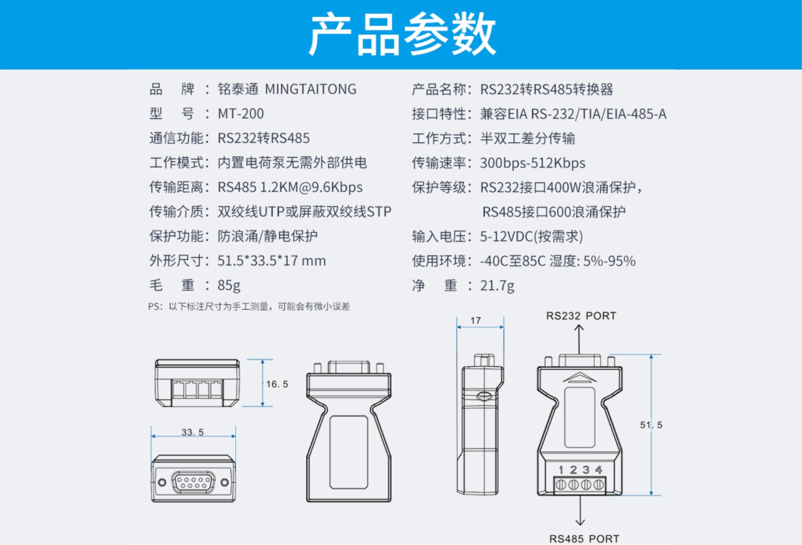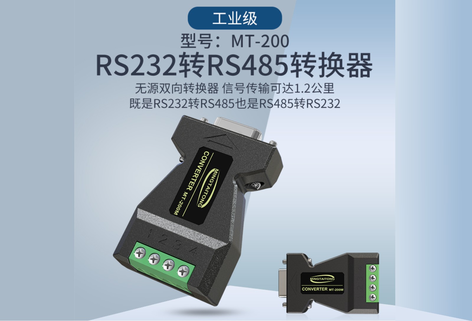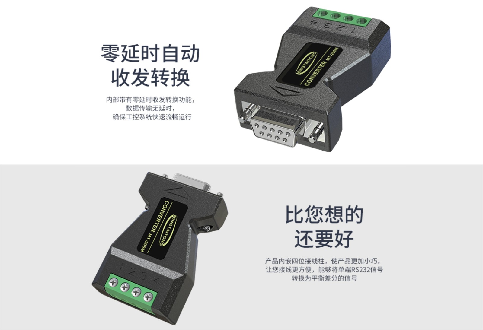 MT-200无源转换器特别适合对空间要求高,不需要供电的环境中使用。针对实验室和和工矿环境的要求,结合研发部门实验大数据,研发而生产出一系列转换器产品。其性能得到了极大的提高,能兼容大多数串口,甚至包括只有三线的串口。